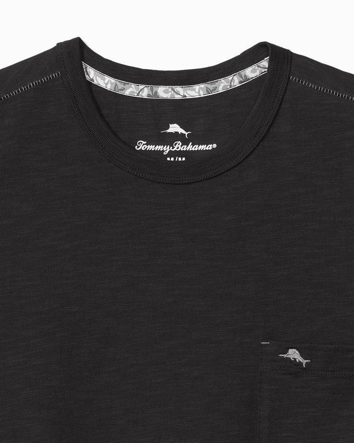 Celebrate in style in this Tommy Bahama Bali Beach Crew T-Shirt in Black. This Bali Beach Crew T-Shirt by Tommy Bahama features washed bci cotton slub jersey crew with inside hibiscus taping. left chest pocket and logo embroidery. This Tommy Bahama Bali Beach Crew T-Shirt is made of 100% Organic Cotton.