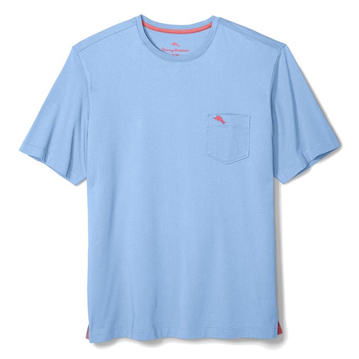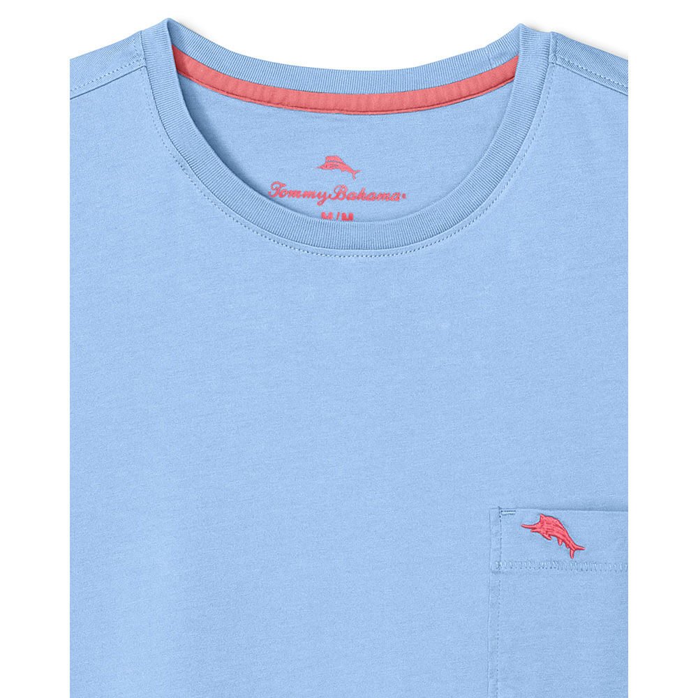 Just in time for vacation. the Tommy Bahama Big & Tall New Bali Skyline T-Shirt in Lt Sky. This Big & Tall New Bali Skyline T-Shirt by Tommy Bahama features solid washed pima cotton jersey crew with pocket and logo embroidery.
