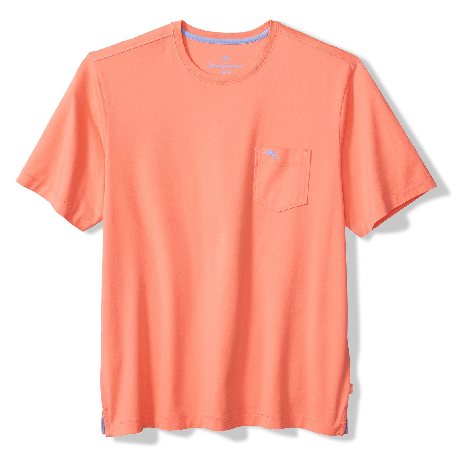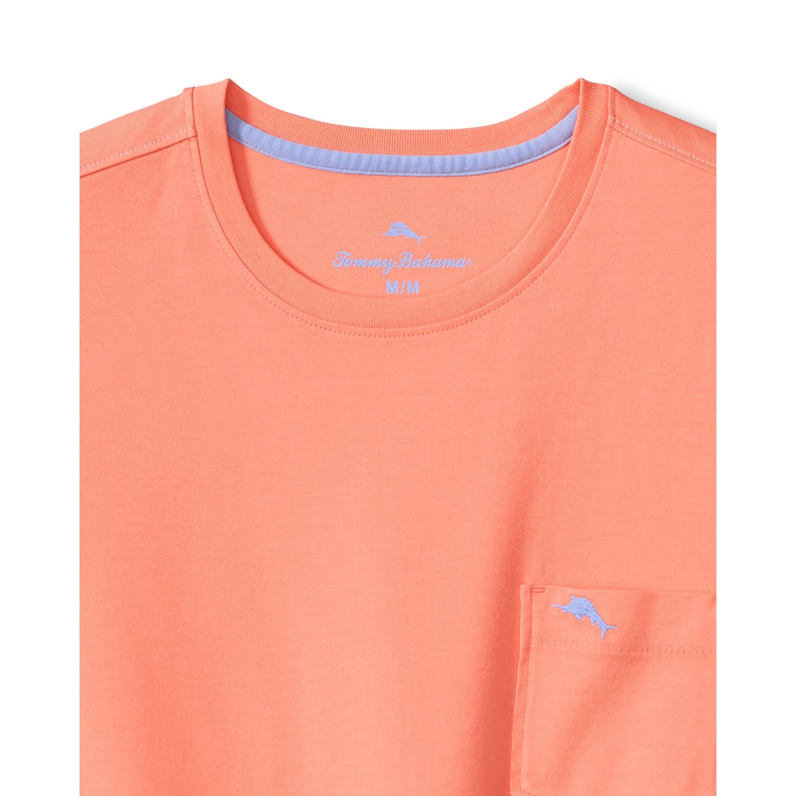 Have fun in the sun in this Tommy Bahama Men’s New Bali Skyline T-Shirt in Passion Peach. This New Bali Skyline T-Shirt by Tommy Bahama features solid short sleeve crew tee with chest pocket. accent. tape trim and accent marlin embroidery. This Tommy Bahama New Bali Skyline T-Shirt is made of 100% Cotton.