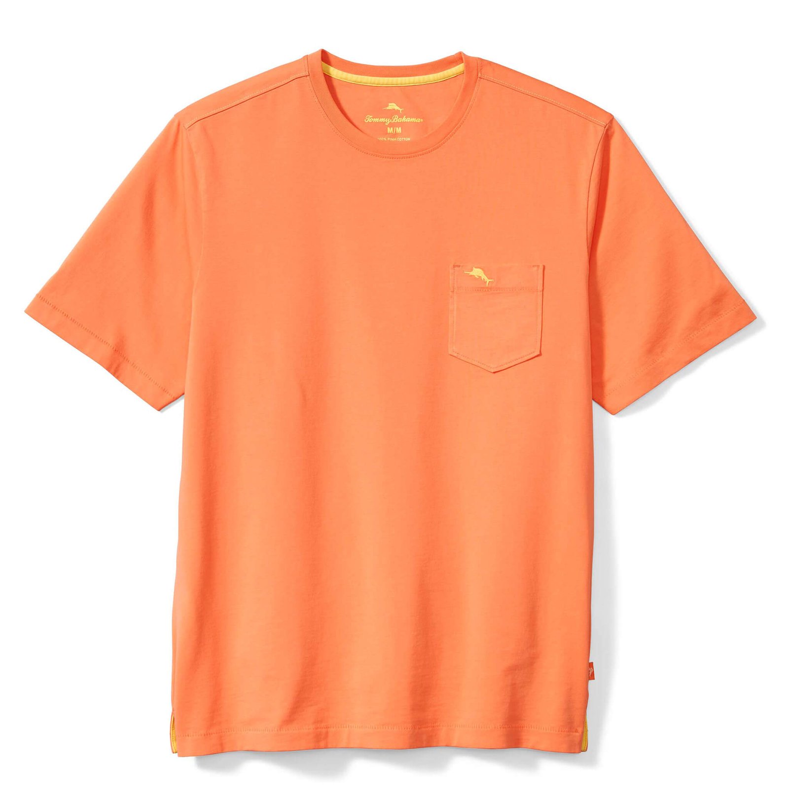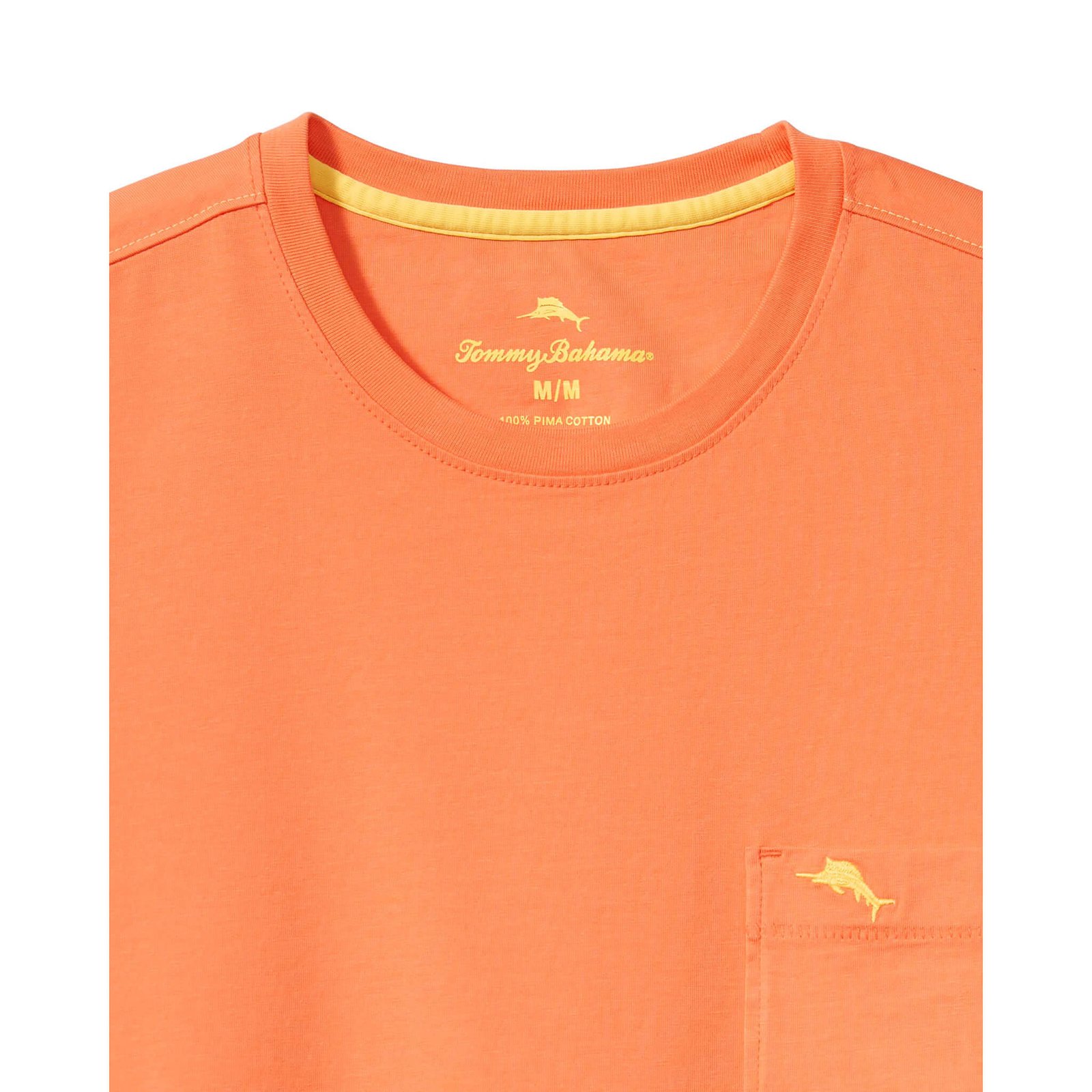 Take a vacation in this Tommy Bahama New Bali Skyline T-Shirt in Peach Melt. This New Bali Skyline T-Shirt by Tommy Bahama features solid washed pima cotton jersey short sleeve crew with pocket and logo embroidery. This Tommy Bahama New Bali Skyline T-Shirt is made of 100% Cotton.
