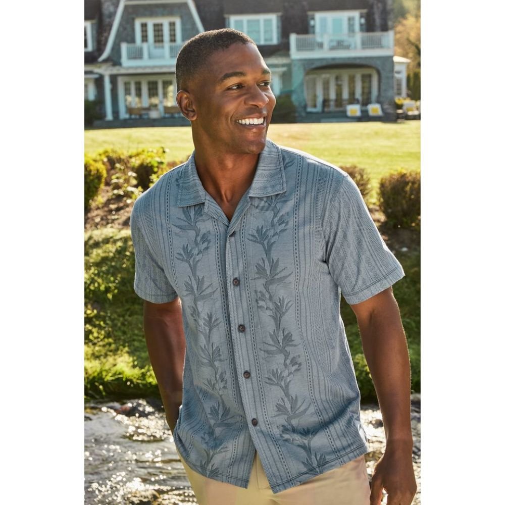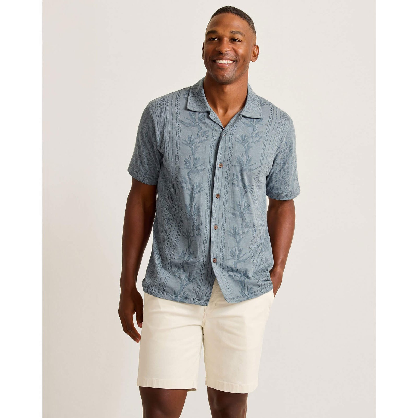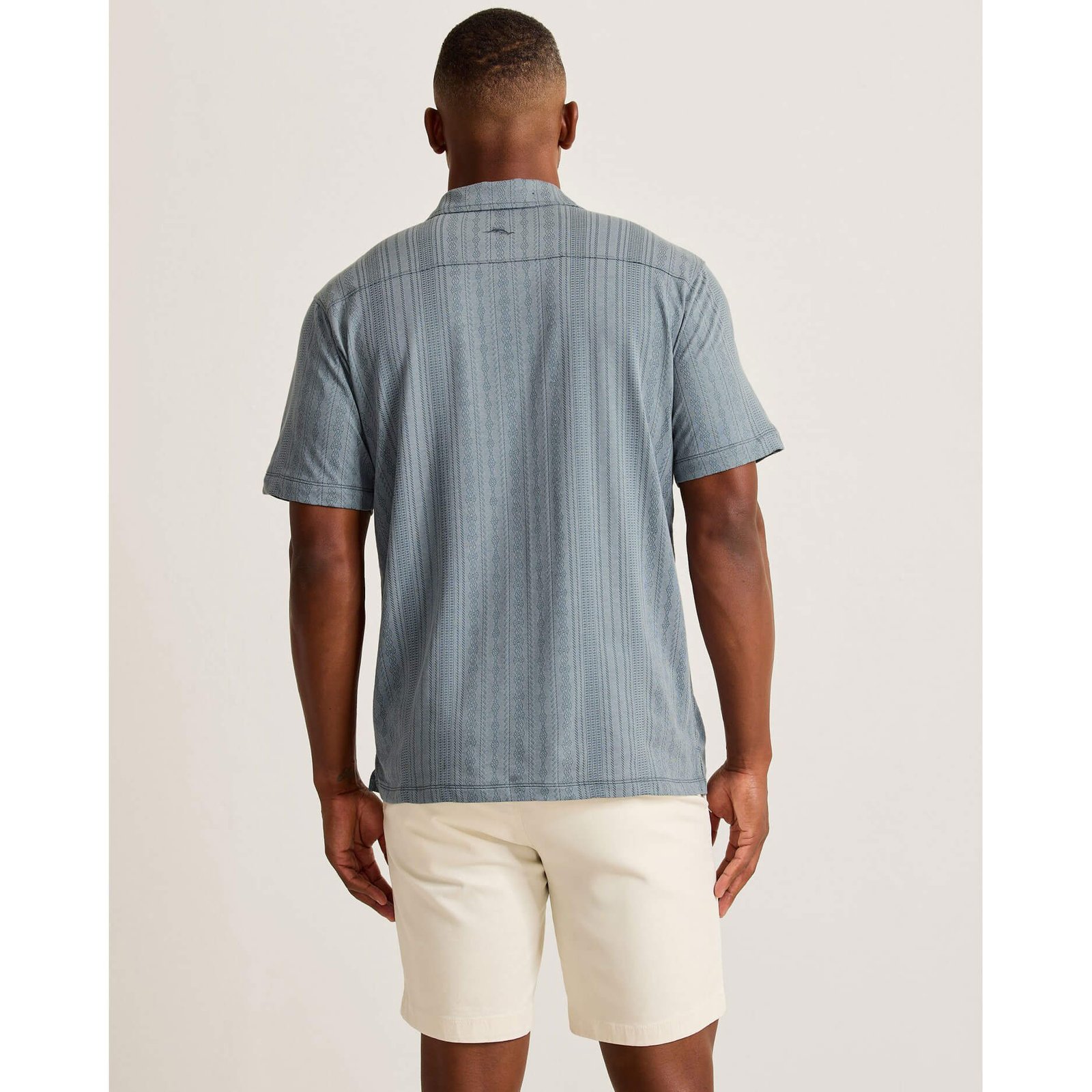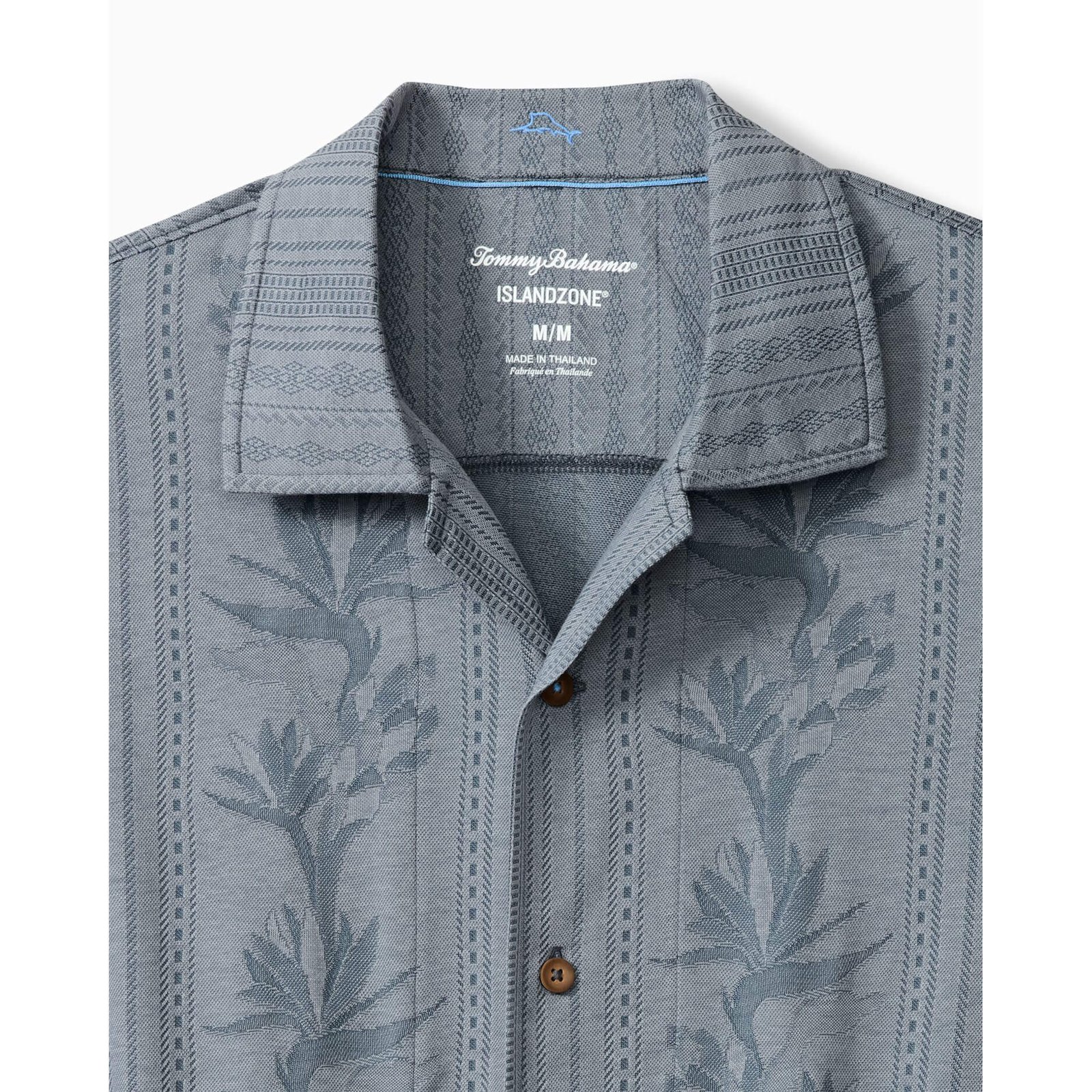 Take a tour of the island in this Tommy Bahama Men’s Palm Fresco Beach Border Camp Shirt in Steel. This Palm Fresco Beach Border Camp Shirt by Tommy Bahama features engineered tonal jacquard knit. short sleeve camp with wicking. quick dry. piping details and marlin embroidery. This Tommy Bahama Palm Fresco Beach Border Camp Shirt is made of engineered tonal jacquard knit. short sleeve camp with wicking. quick dry. piping details and marlin embroidery. This Tommy Bahama Palm Fresco Beach Border Camp Shirt is made of 56% Cotton. 44% Recycled Polyester.