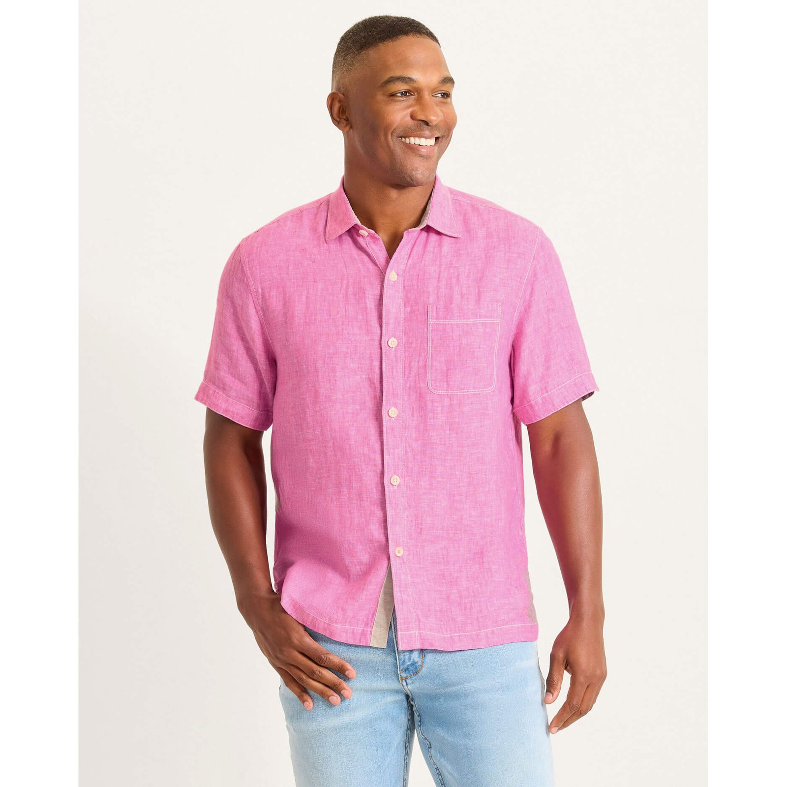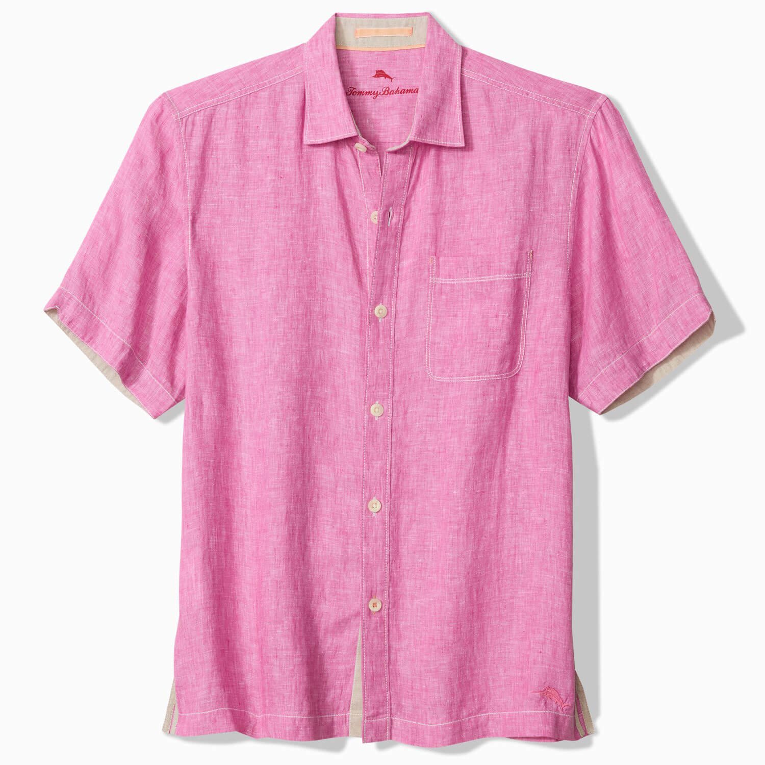 Have fun and relax on the island in this Tommy Bahama Men’s Paradise Breezer Linen Short Sleeve Camp Shirt in Pink Umbrella. This Paradise Breezer Linen Short Sleeve Camp Shirt by Tommy Bahama features yarn dyed short sleeve craig collar with rounded pocket and straight hem. This Tommy Bahama Paradise Breezer Linen Short Sleeve Camp Shirt is made of 100% Linen.