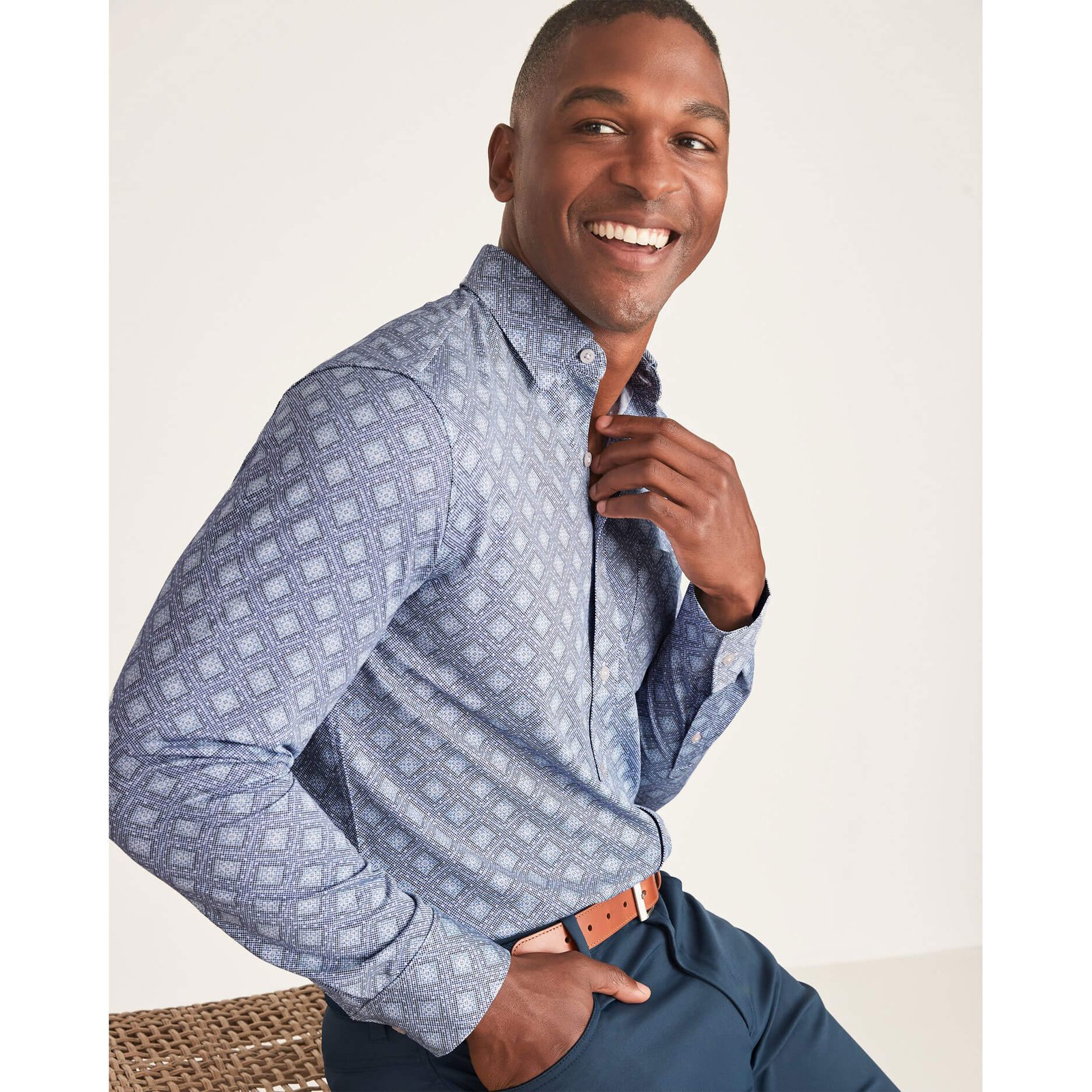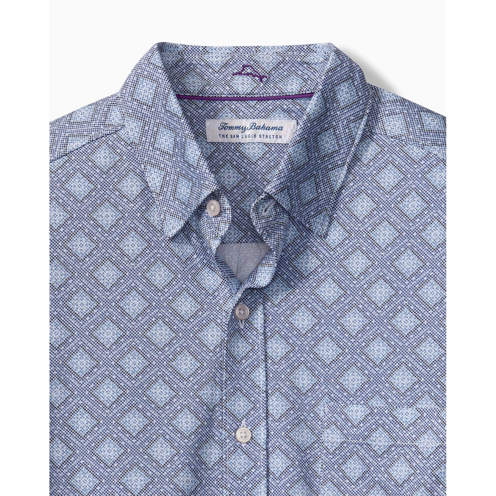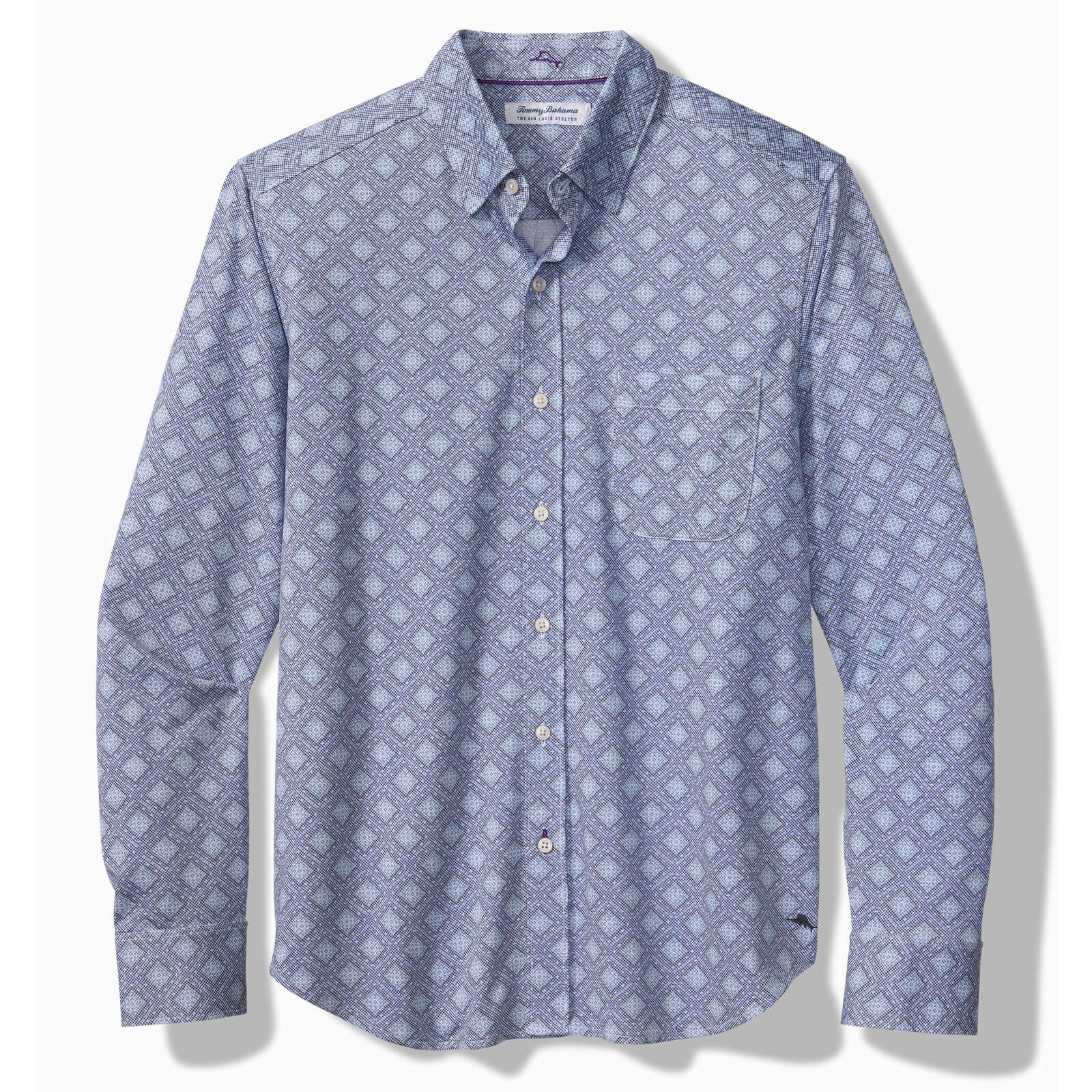 Get ready for a fun day on the island in this Tommy Bahama Men’s San Lucio Mira Mosaic Sport Shirt in Eclipse. This San Lucio Mira Mosaic Sport Shirt by Tommy Bahama features printed knit long sleeve bottom front shirt with wicking. quick dry. chest pocket and piping details. This Tommy Bahama San Lucio Mira Mosaic Sport Shirt is made of printed knit long sleeve bottom front shirt with wicking. quick dry. chest pocket and piping details. This Tommy Bahama San Lucio Mira Mosaic Sport Shirt is made of 57% Supimacotton. 43% Recycled Polyester.