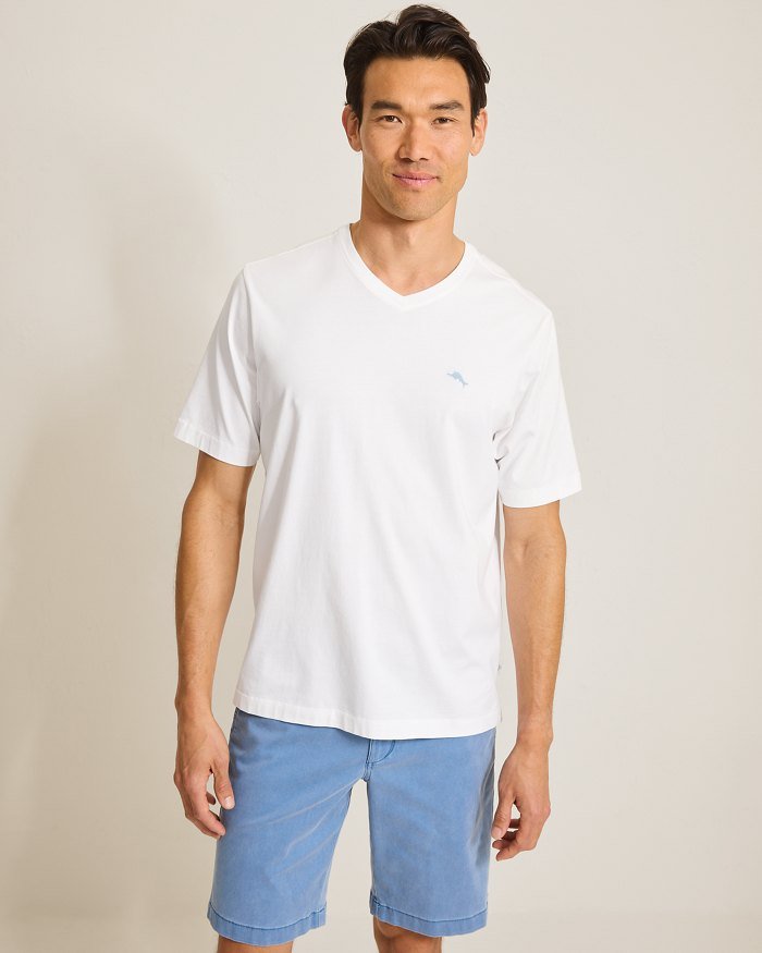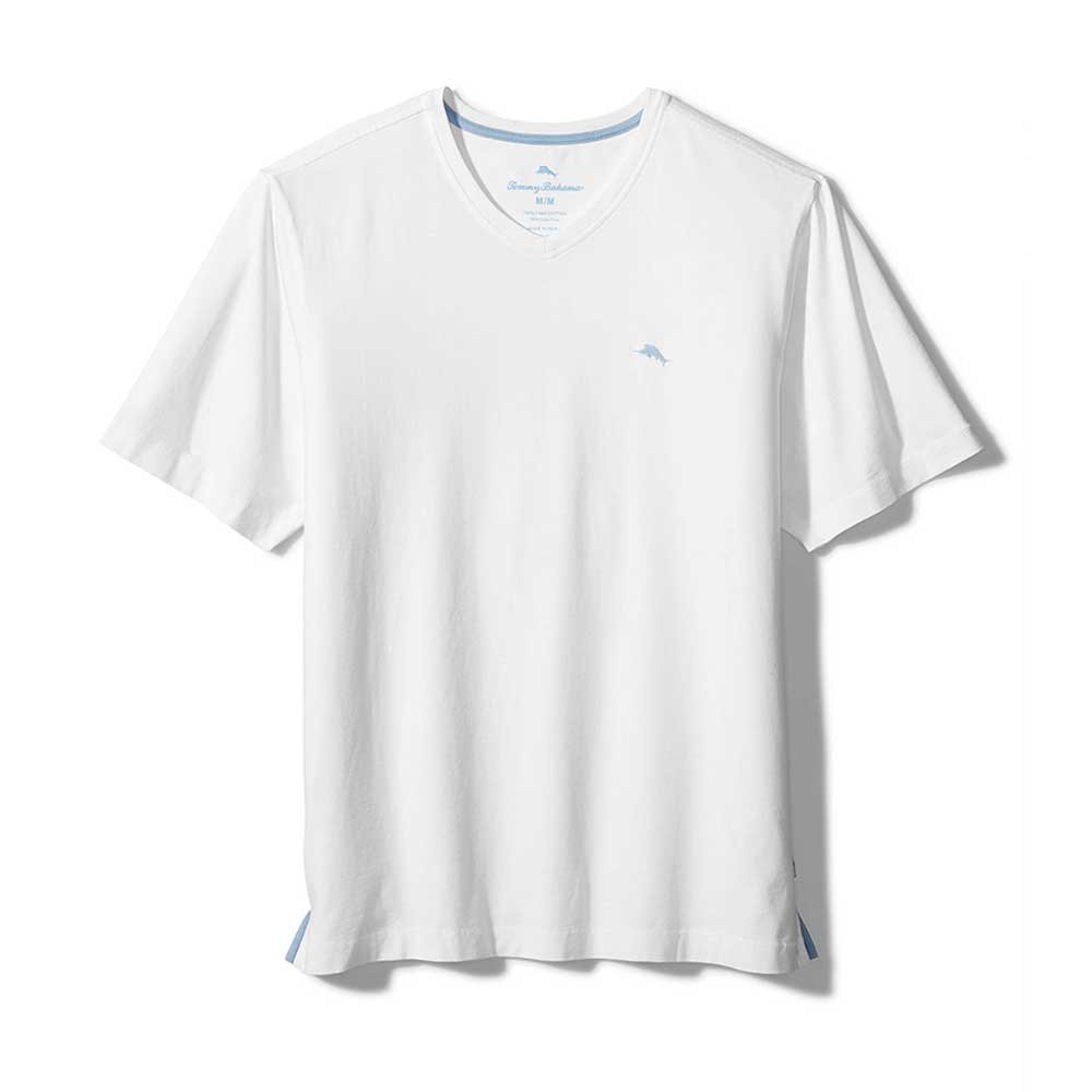 Have a fun trip to the island in this Tommy Bahama New Bali Skyline V-Neck T-Shirt in White. This New Bali Skyline V-Neck T-Shirt by Tommy Bahama features solid washed pima cotton jersey short sleeve V-neck with accent inside neck taping & left chest logo embroidery. This Tommy Bahama New Bali Skyline V-Neck T-Shirt is made of 100% Pima Cotton.