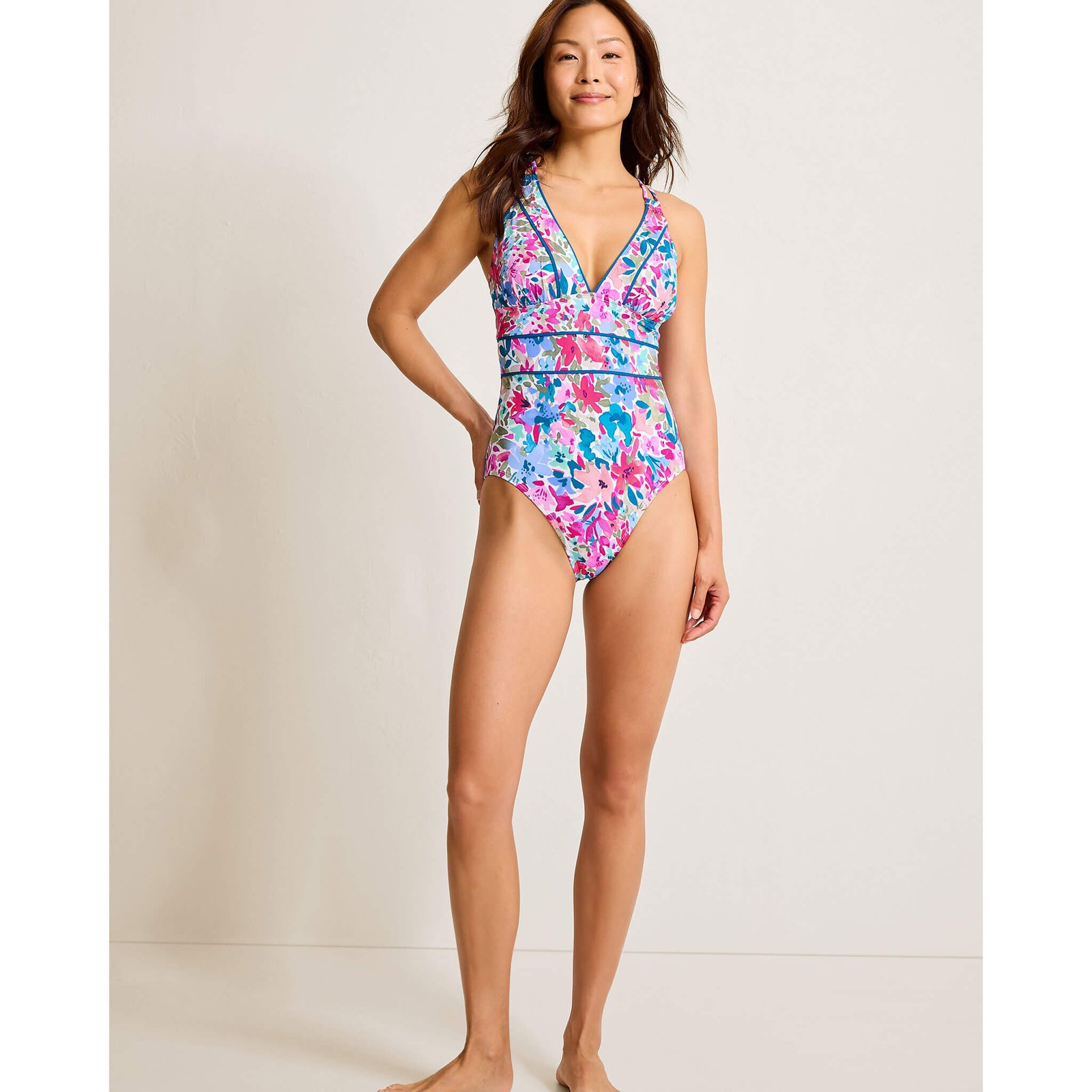 Hit the beach in style in the Tommy Bahama Watercolor Floral V Neck One Piece Swimsuit – Dusty Lupine. This Tommy Bahama Swimsuit is made of 85% Recycled Nylon. 15% Spandex. For best results. hand wash your Tommy Bahama Swimwear.