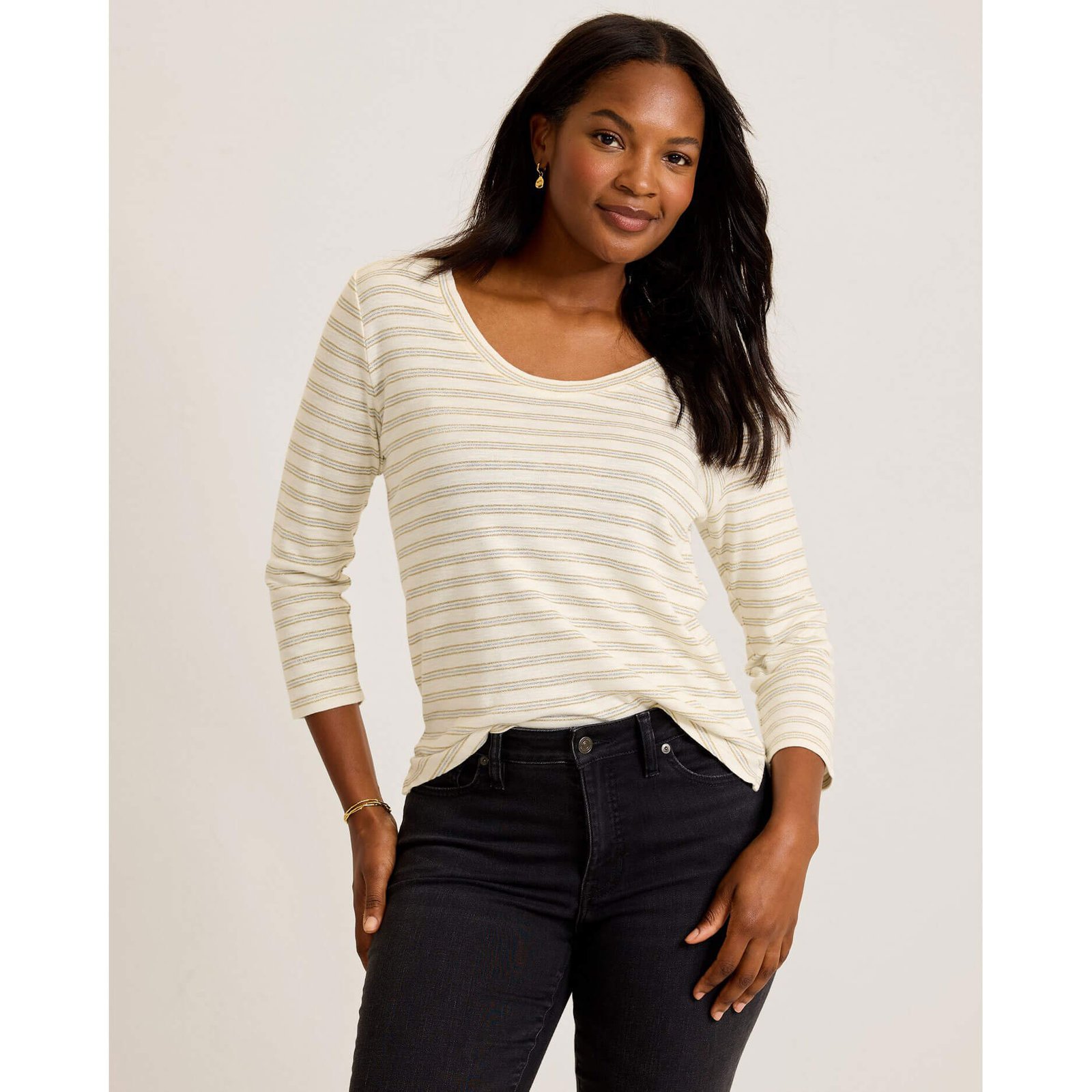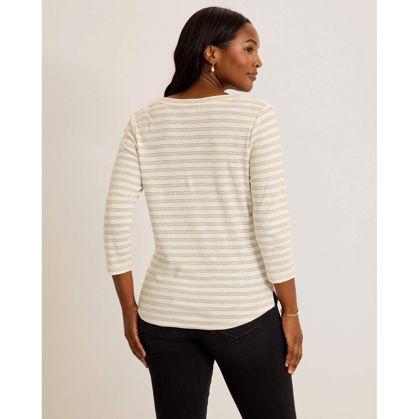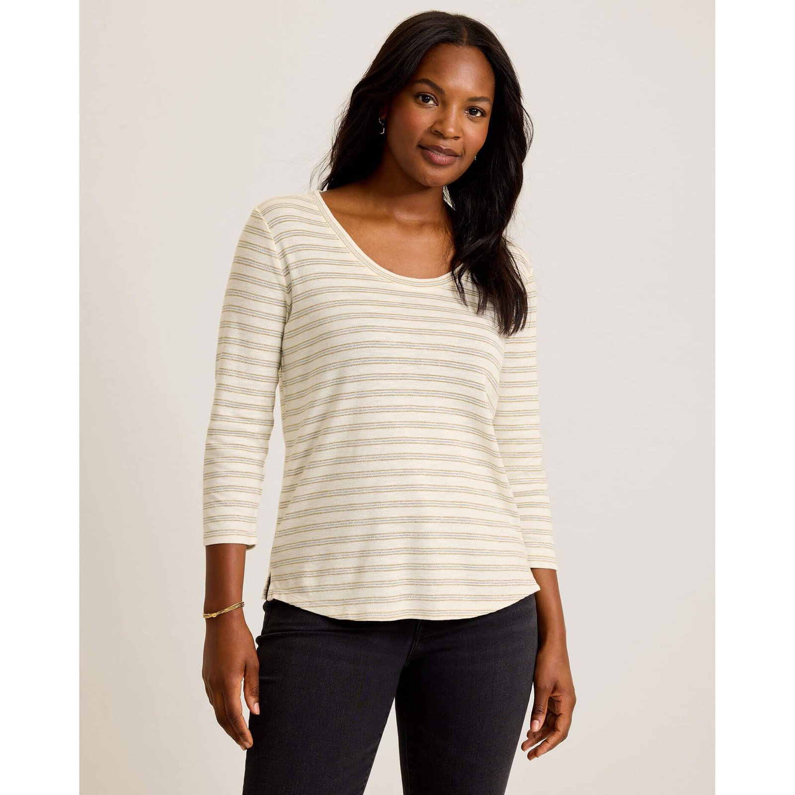 Enjoy a fun day on the island in this Tommy Bahama Women’s Ashby Isles Metallic Stripe T-Shirt in Coconut. This Ashby Isles Metallic Stripe T-Shirt by Tommy Bahama features 3/4 sleeves. scoop neck. back length: 26″ from shoulder to hem (size s). This Tommy Bahama Ashby Isles Metallic Stripe T-Shirt is made of 82% Cotton. 8% Nylon. 7% Metallic. 3% Polyester. Machine Wash Cold With Like Colors On Gentle. Non-Chlorine Bleach. Tumble Dry Low. Cool Iron. Can Dry Clean..