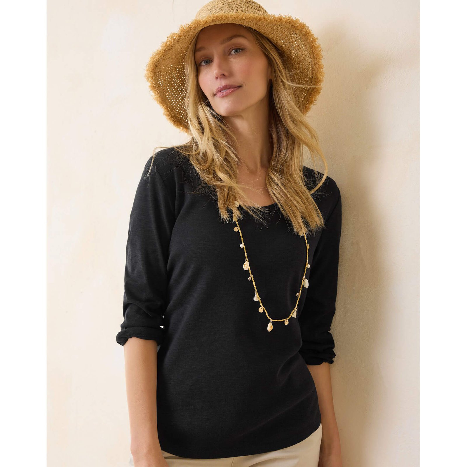 Stay in comfort all day in this Tommy Bahama Women’s Ashby Isles Rib 3/4 Sleeve Scoop Top in Black. This Ashby Isles Rib 3/4 Sleeve Scoop Top by Tommy Bahama features Slight high-low hem. Back length: 26″ from shoulder to hem (size S). This Tommy Bahama Ashby Isles Rib 3/4 Sleeve Scoop Top is made of 100% Cotton.