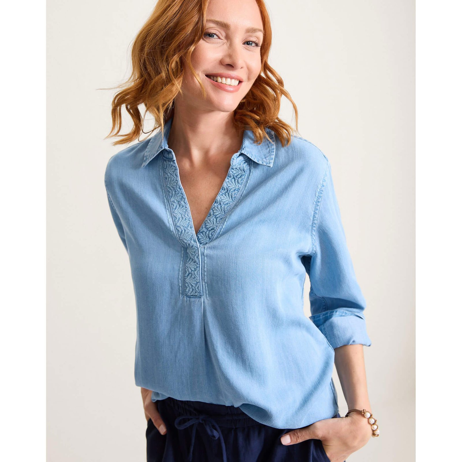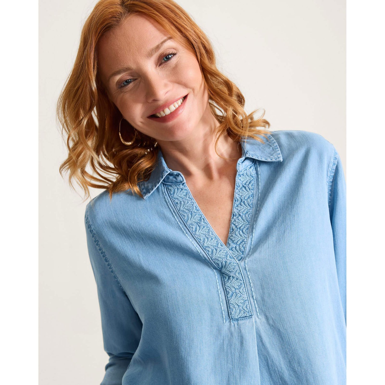 Tommy Bahama Women’s Chambray O’Lei Embroidered Popover Top – Light Indigo Wash
