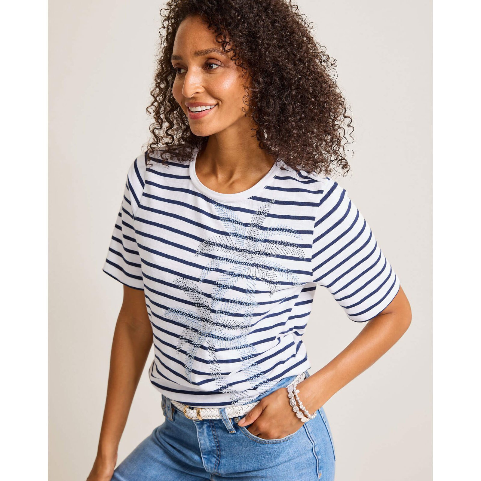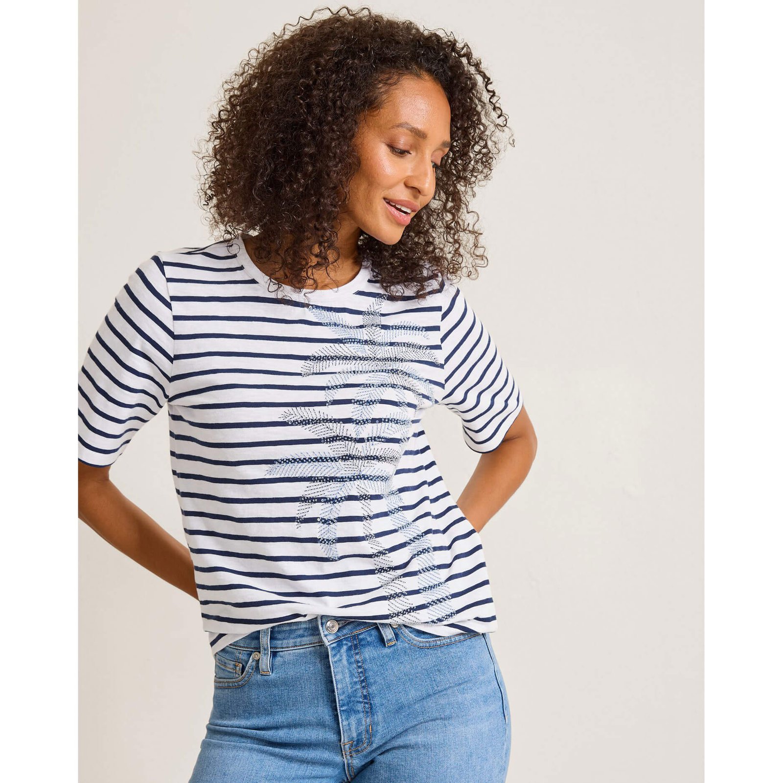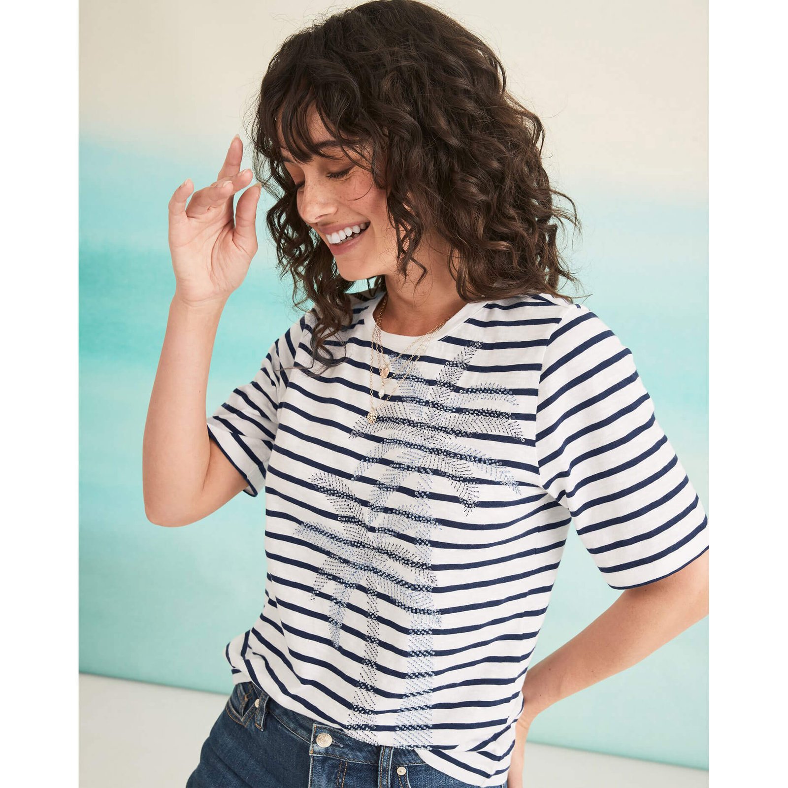 Have fun in the sun in this Tommy Bahama Women’s Indigo Palms Stripe Lux T-Shirt in White. This Indigo Palms Stripe Lux T-Shirt by Tommy Bahama features crew neck. short sleeve. stripe with palm tree design. back length: 23 1/2″ from shoulder to hem (size s). This Tommy Bahama Indigo Palms Stripe Lux T-Shirt is made of 100% Organic Cotton. Machine Wash Cold With Like Colors On Gentle With Mild Detergent. Non-Chlorine Bleach. Tumble Dry Low. Cool Iron. Do Not Dry Clean..