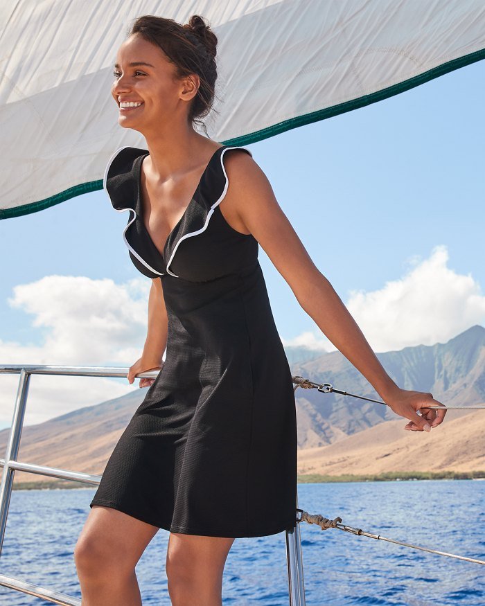The Tommy Bahama Womens Island Cays Cabana Flounce Spa Coverup in Black effortlessly exudes beachside elegance. Crafted from Tommy Bahama’s luxuriously textured piqué fabric. this flattering coverup dress. complete with a dainty ruffle neckline and contrasting white trim. is a timeless style you’ll want to flaunt on every beach vacation. near or far!
