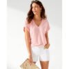 Be in comfort all day in this Tommy Bahama Women’s Kauai Jersey V-Neck T-Shirt in Bikini Heather. This Kauai Jersey V-Neck T-Shirt by Tommy Bahama features 25″ from shoulder to hem (based on a size s). rolled cuff at sleeves. designed to be an easy fit for a less generous fit. order a size down. This Tommy Bahama Kauai Jersey V-Neck T-Shirt is made of 67% Modal. 28% Polyester. 5% Spandex.