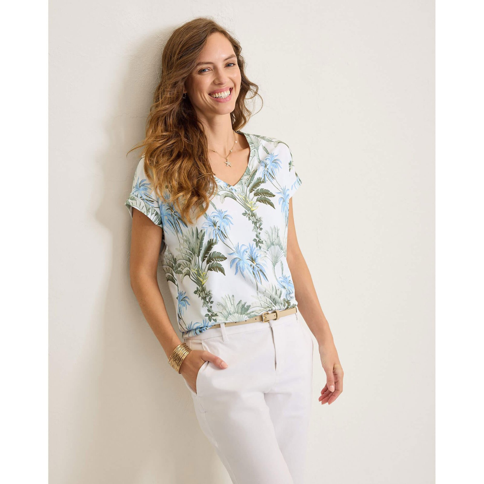 Elevate your style in this Tommy Bahama Women’s Kauai Palisade Palms V-Neck T-Shirt in White. This Kauai Palisade Palms V-Neck T-Shirt by Tommy Bahama features v-neck. short sleeves. allover floral pattern. This Tommy Bahama Kauai Palisade Palms V-Neck T-Shirt is made of 57% Cotton. 38% Tencel Modal. 5% Spandex. Machine Washable.