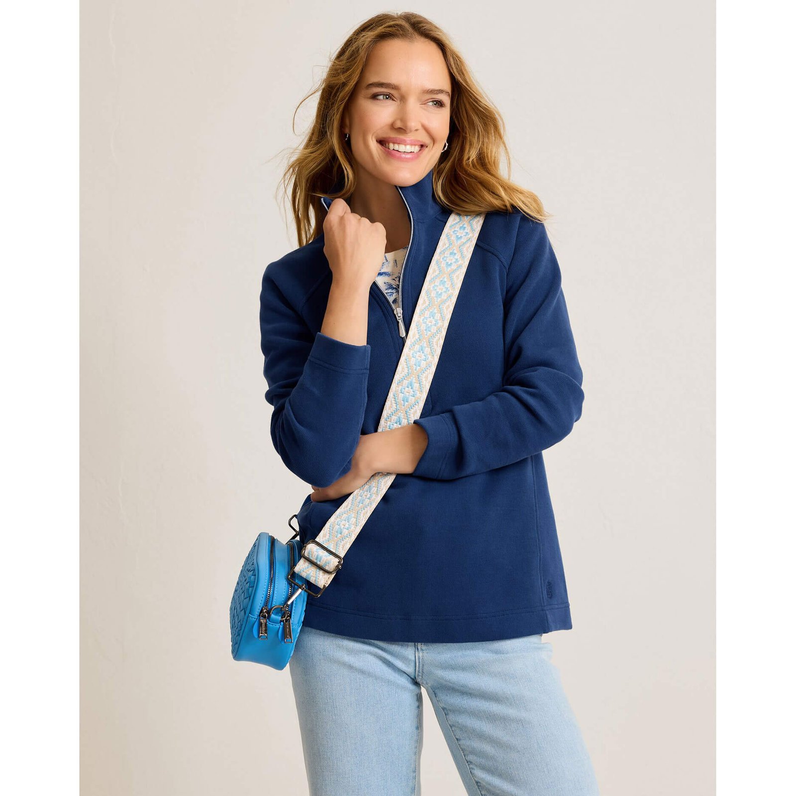 Go out and explore the island in this Tommy Bahama Women’s New Aruba Half Zip Pullover Sweatshirt in Island Navy. This New Aruba Half Zip Pullover Sweatshirt by Tommy Bahama features half-zip sweatshirt with a hint of stretch. clean stitching details. back length: 26.75″ from shoulder to hem (size s). This Tommy Bahama New Aruba Half Zip Pullover Sweatshirt is made of 98% Cotton. 2% Spandex. Zip Garment Before Cleaning. Machine Wash Cold With Like Colors On Gentle. Non-Chlorine Bleach. Tumble Dry Low. Warm Iron. Do Not Iron The Decoration. Do Not Dry Clean..