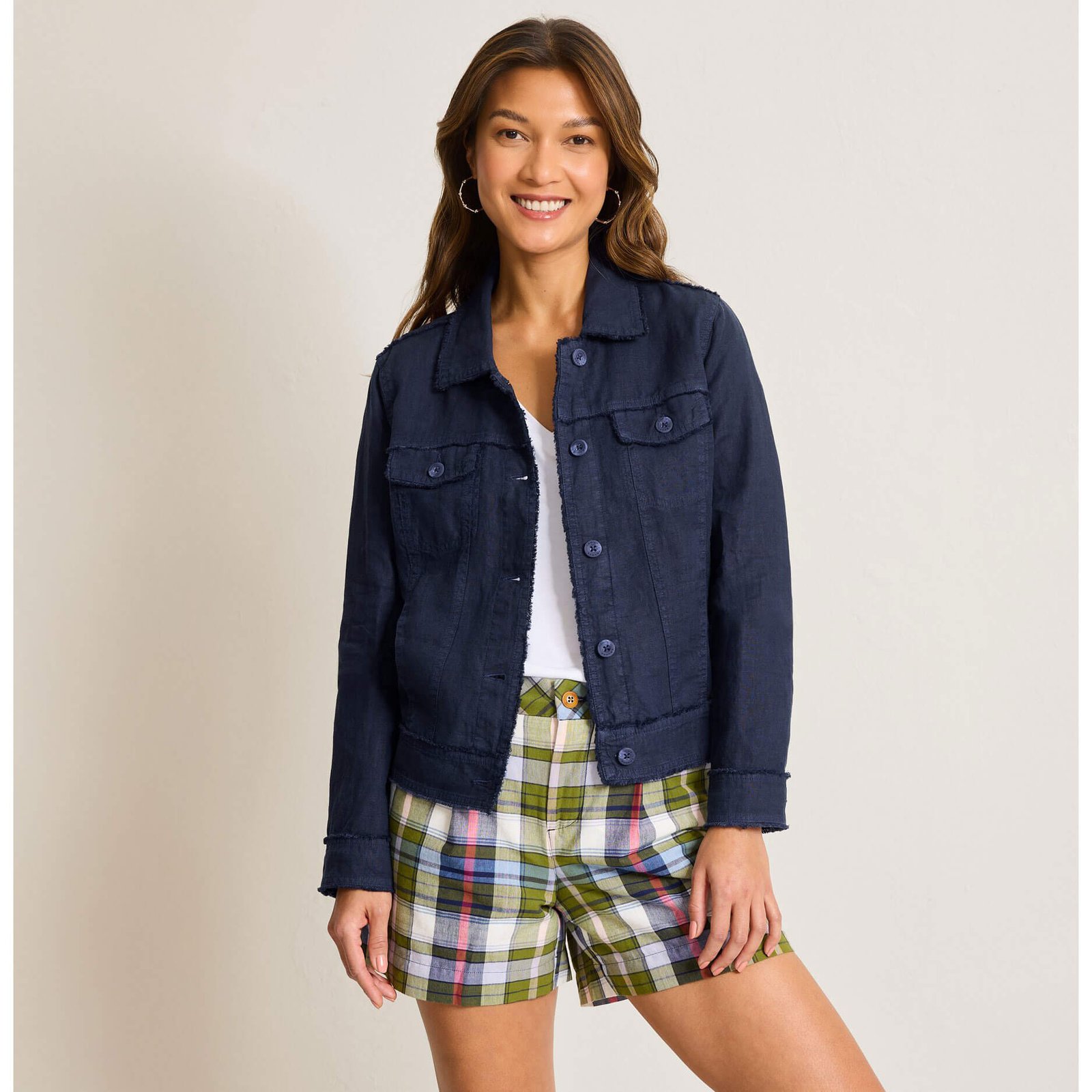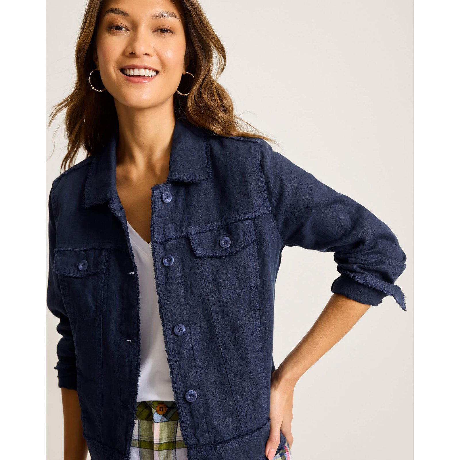 Get ready for a great day in this Tommy Bahama Women’s Two Palms Raw Edge Linen Jacket in Coastline. This Two Palms Raw Edge Linen Jacket by Tommy Bahama features Vertical seaming creates slimming lines. Pockets. 22″ shoulder to hem (based on size S). This Tommy Bahama Two Palms Raw Edge Linen Jacket is made of 100% Linen.