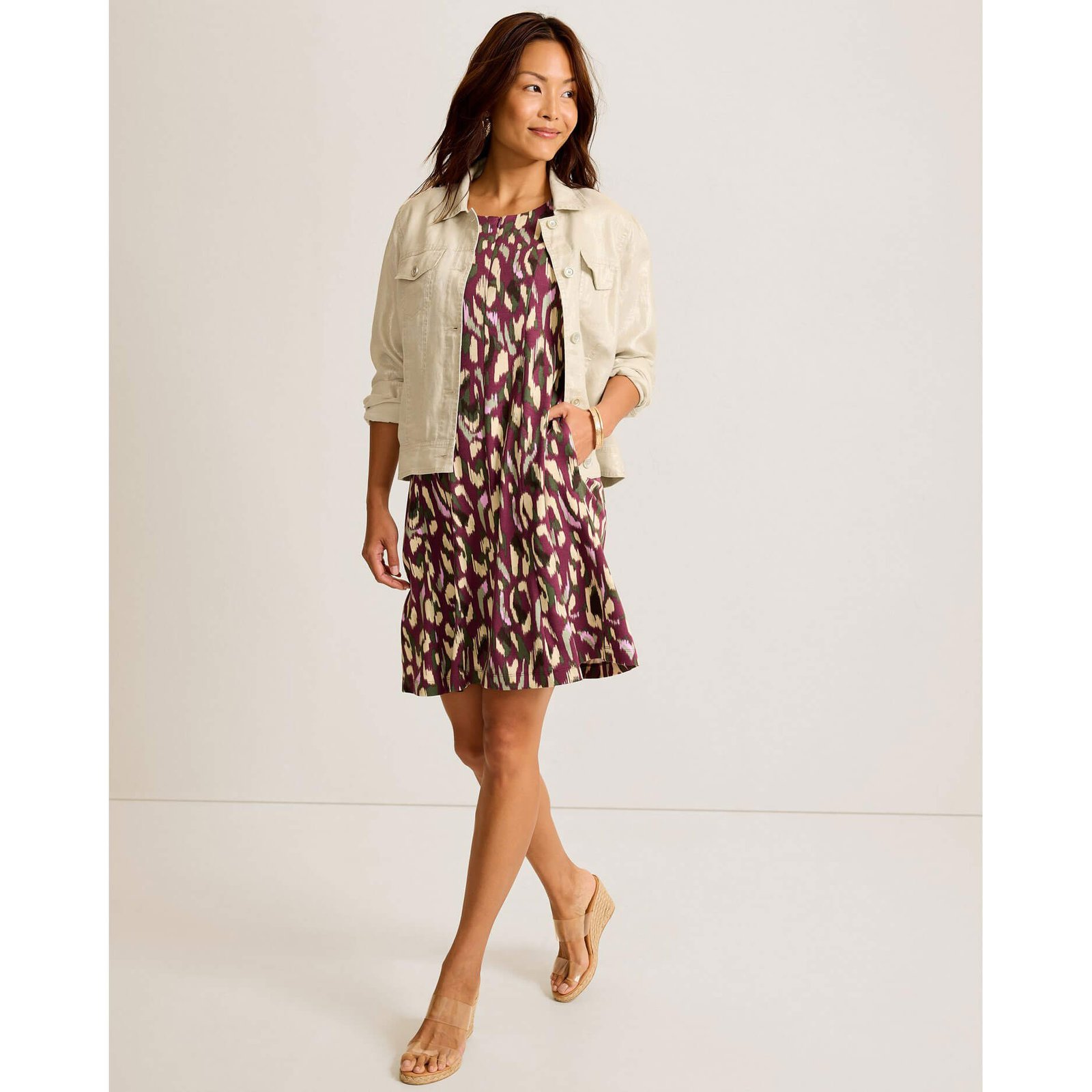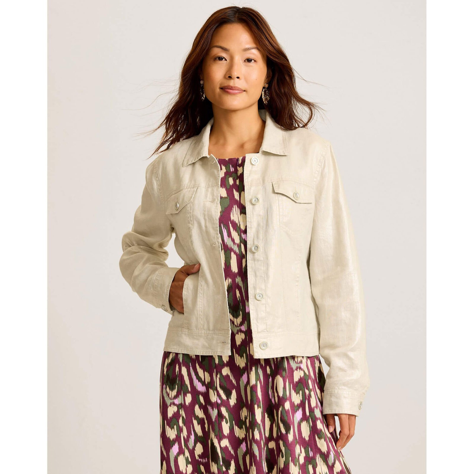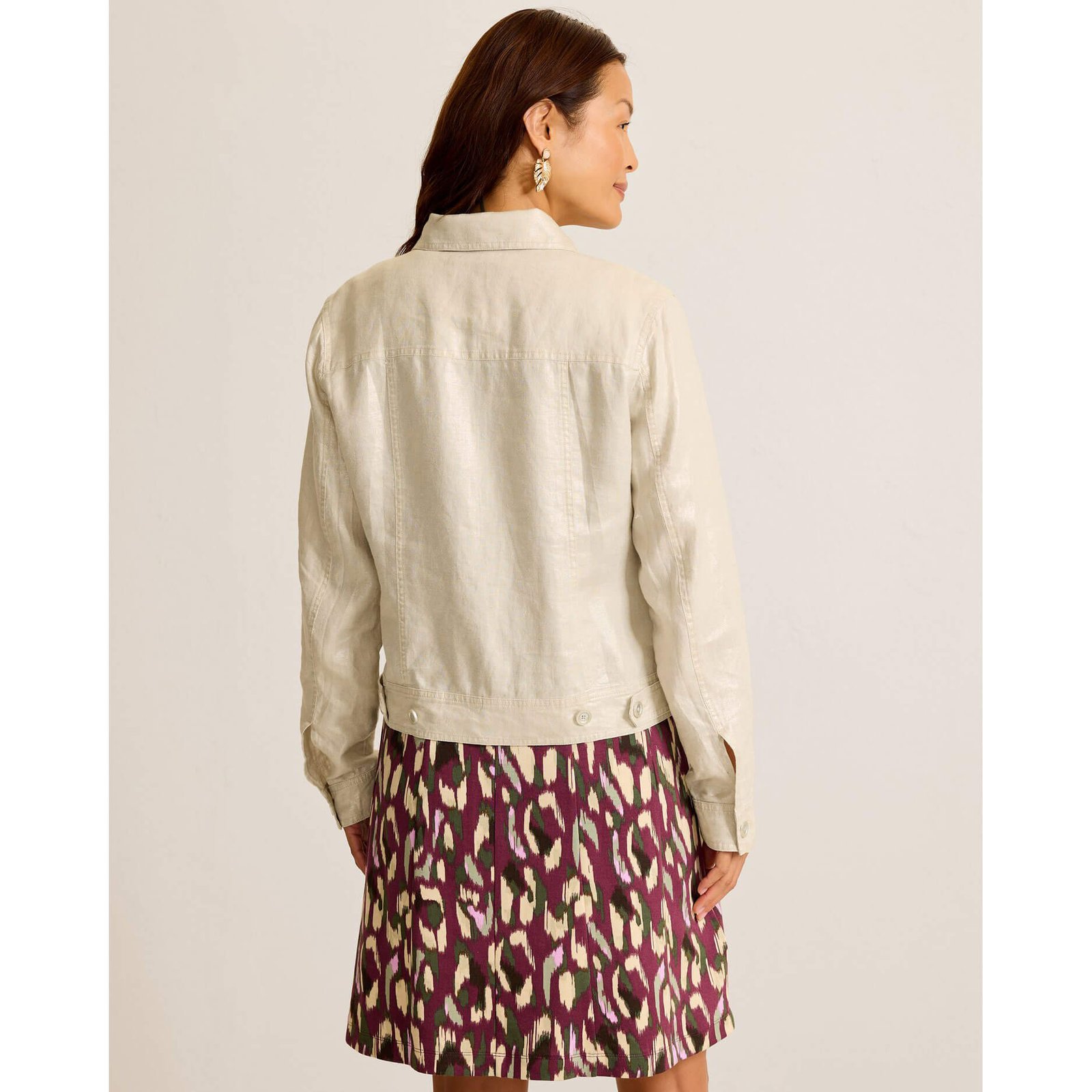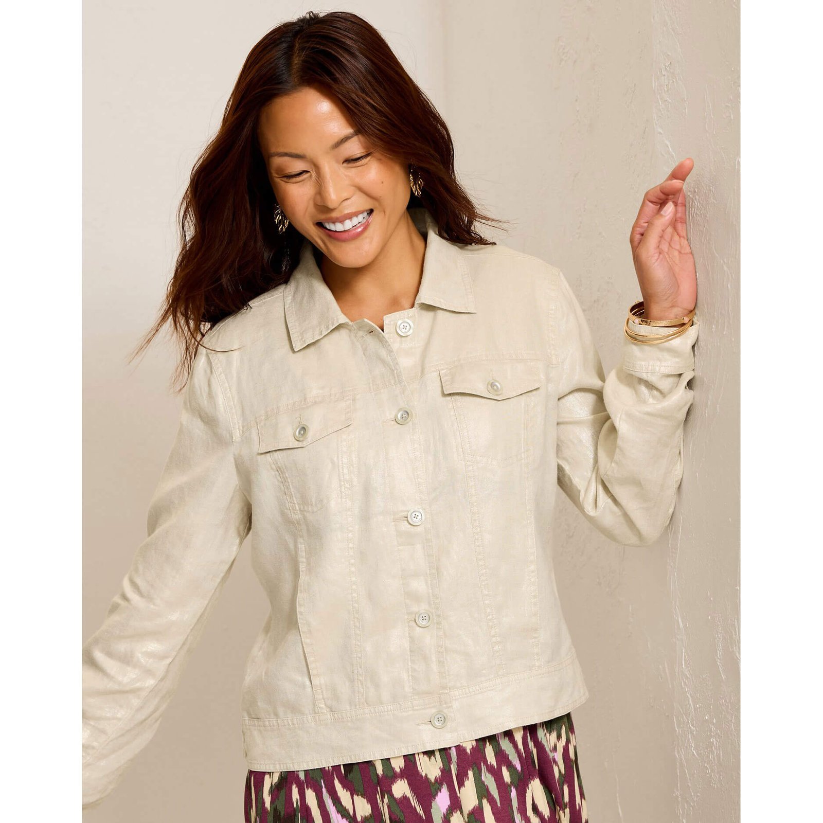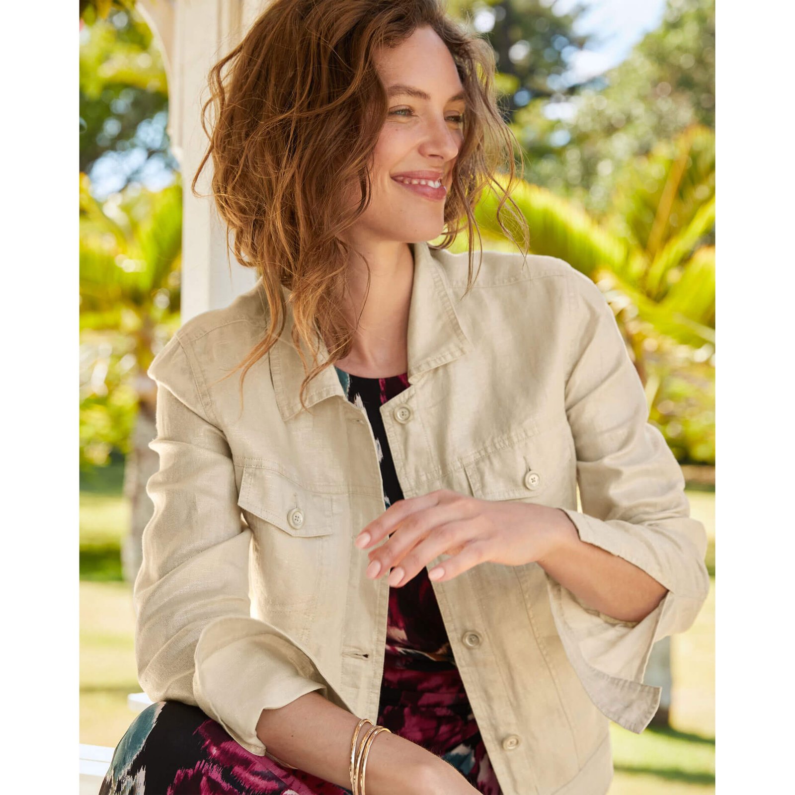 Relax in paradise in this Tommy Bahama Women’s Two Palms Shimmer Linen Jacket in Seedpearl. This Two Palms Shimmer Linen Jacket by Tommy Bahama features solid long sleeve. button front. chest pockets. back length: 22.5″ from shoulder to hem (size s). This Tommy Bahama Two Palms Shimmer Linen Jacket is made of 100% Linen.